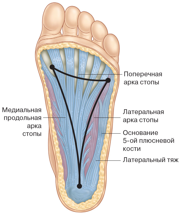 Рис. 3.8. Подошвенный апоневроз образует «батут» под арками стопы – единую пружинистую арку между точками контакта стопы с опорой: головкой 5-ой плюсневой кости, головкой 1-ой плюсневой кости и пяткой