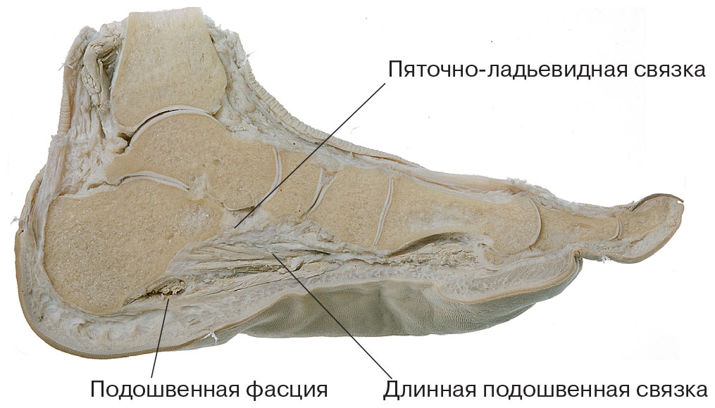 Рис. 3.9. Сагиттальный разрез медиальной продольной арки стопы, демонстрирующий, каким образом подошвенная фасция и расположенные еще глубже ткани образуют несколько слоев «тетивы», которые поддерживают медиальную арку стопы и выполняют роль пружин (©Ralph T. Hutchings. Воспроизведено с любезного разрешения Abrahams, и соавт., 1993.)