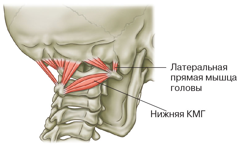 Рис. 3.27. Вид сбоку на подзатылочные мышцы показывает нам, как Малая ПЗМГ и Верхняя КМГ тянут череп вниз и вперед, в то время как БолПЗМГ тянет череп вниз и чуть-чуть назад. В экстремальных ситуациях они работают все вместе. Но для «тонкой настройки» взаимодействия между головой и шеей важна их дифференциация. Она способствует интеграции миофасциальной работы крупных мышц позвоночника для обеспечения функционального движения