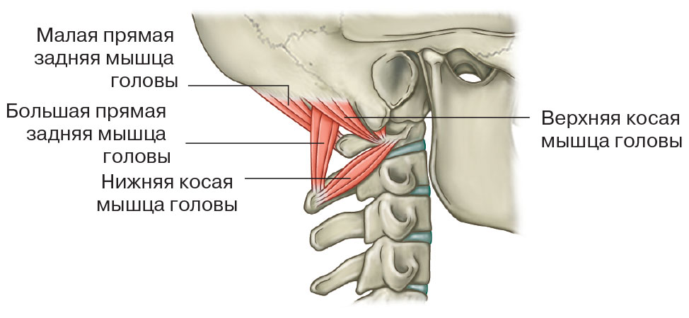 Самая латеральная из этих трех мышц, верхняя косая мышца головы (ВерхКМГ), проходит от заднелатеральной части затылка вниз и вперед к большим ПО атланта. Эта мышца проходит параллельно МалПЗМГ и выполняет аналогичную ей функцию – тянет затылок вперед по атланту (а также, если с одной стороны она короче, чем с другой, – способствует постуральной ротации в АЗ суставе).
