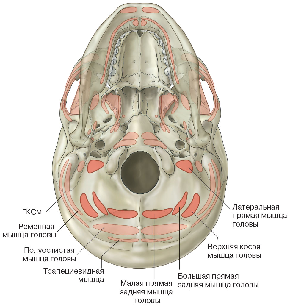 Рис. 3.28. Вид на череп снизу. Три средних пальца руки, как правило, легко ложатся на начало трех подзатылочных мышц, расположенных в самом глубоком уровне верхнего отдела позвоночника