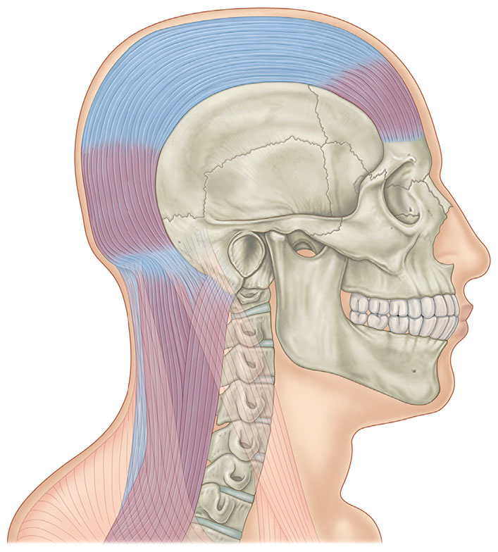 Рис. 3.29. От фасции мышц, выпрямляющих позвоночник, ПЗЛ поднимается на вершину черепа, по сухожильному шлему (фасции черепа), где прочно прикрепляется к лобной надбровной дуге