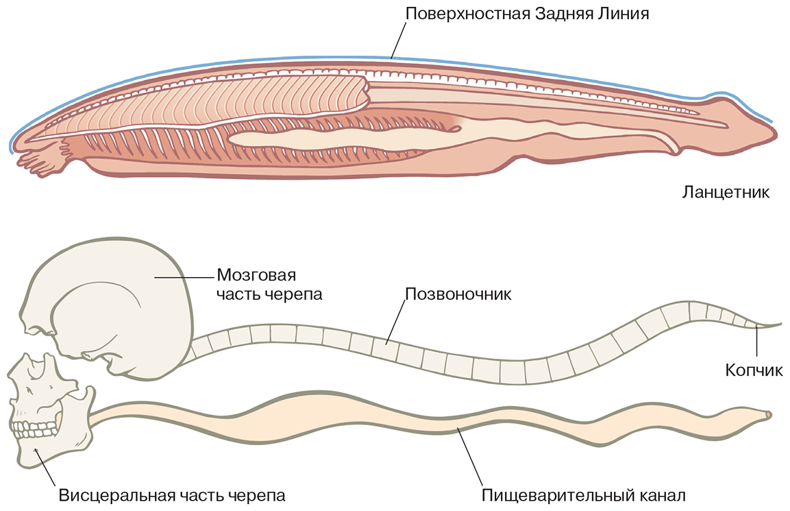 Рис. 3.30. Наш, казалось бы, прочный и цельный череп в действительности сформировался из двух разных эмбриологических источников. Глядя на черепа примитивных хордовых и ранних рыб, мы видим, что у этих животных был череп, но не было лицевых костей. Нейрокраниальная часть нашего черепа является продолжением позвоночника, в то время как висцерокраниальные лицевые структуры развились из жаберного аппарата. ПЗЛ заканчивается на передней границе мозговой части черепа
