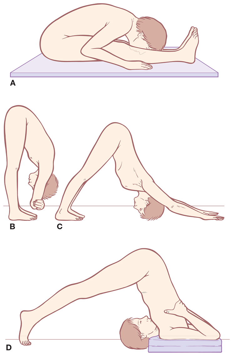 Упражнения на растяжение (в порядке усложнения) включают в себя наклон вперед в положении сидя (рис. 3.31А), наклон вперед в положении стоя (рис. 3.31В), «Собаку мордой вниз» (рис. 3.31С), и «Плуг» (рис. 3.31D).