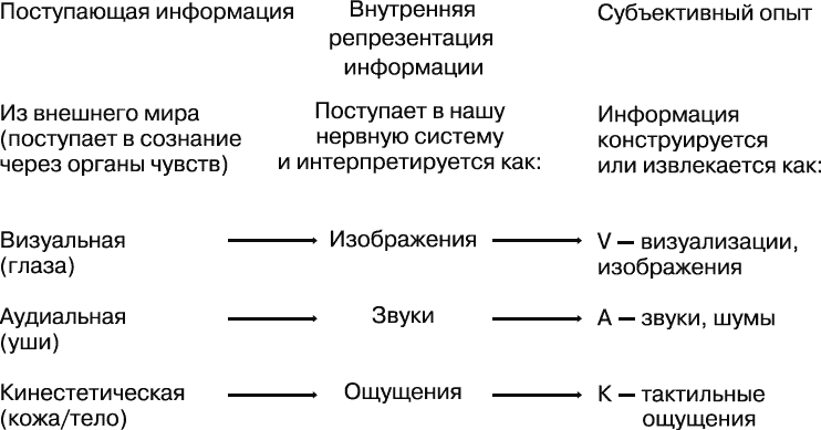 При получении информации о внешнем мире мы опираемся на наши органы чувств. На теле человека расположены многочисленные чувствительные рецепторы. Кроме этих нервных механизмов мы не обладаем другим способом получения информации об окружающем мире. Фактически, весь наш опыт формируется на основе зрительных, слуховых, вкусовых, тактильных и обонятельных ощущений (именно эти пять сенсорных модальностей наиболее важны, хотя кроме них существуют и другие). В НЛП мы называем эти модальности репрезентативными системами. При анализе индивидуальных навыков мы обнаруживаем, что их функционирование связано с развитием и программированием основных репрезентативных систем.