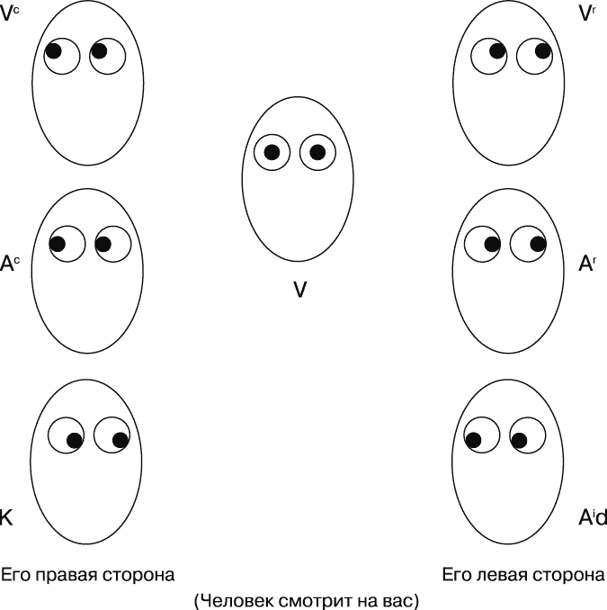 ● Глаза никогда не занимают какое-то конкретное положение: возможно, у человека заблокированы системы V, А или К, и, таким образом, он избегает этого положения.