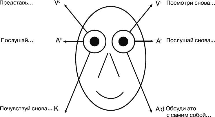 Предупреждение. Иногда, задавая вопросы о прошлых переживаниях, вы можете получить немедленные кинестетические ответы, так как старые воспоминания могут быть связаны с причиняющими боль чувствами. Предположим, человек, будучи ребенком, получил тяжелую травму в своей спальне, а вы задали вопрос: «Какого цвета были стены твоей детской спальни?» Не ожидайте в этот момент паттерна движений глаз, соответствующего визуальному припоминанию. Вы немедленно получите кинестетический ответ и другую сенсорную обратную связь, такую как покраснение лица и наполненные слезами глаза. Когда такое происходит, я (Б. Б.) иногда говорю клиенту: «С этим воспоминанием у вас связаны некоторые эмоции, не так ли?» Это может поддержать и усилить раппорт.