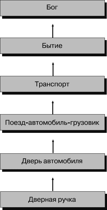 Обратите внимание на то, что на рис. 1.4 вышерасположенным словам соответствуют более высокие уровни абстракции. Начните со слова «транспорт». Мы знаем, что это слово располагается на более высоком логическом уровне, чем слово «автомобиль», так как понятие «транспорт» включает автомобили, но не только их. Слово «автомобиль» включает термин «дверь автомобиля», но не только его, и т. д. Следовательно, каждое слово является абстракцией более высокого уровня, так как оно включает то, что располагается ниже, и еще что-то. В этой модели метасостояний важную роль играет открытие, сделанное Грегори Бейтсоном: более высокие уровни организуют более низкие уровни (Bateson, 1972). Термин «метауровни» относится к расположенным выше логическим уровням.