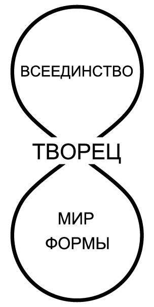 Ещё раз повторю, что реальность не является линейной, но я дам вам линейный образ. Представьте фигуру «восемь». Она состоит из верхней части, нижней и центра – точки пересечения. Ваш Творец представлен этим пересечением, точкой встречи верхней и нижней фигур. Нижняя фигура представляет мир формы, который сотворён вашим Творцом и в котором вы живёте. Верхняя фигура представляет – не совсем подходящим образом – уровень Бога, реальность Бога, которая выше вашего Творца. Этот уровень Бога я хотел бы назвать Чистым Бытием Бога или Всеединством* Божественного Присутствия.