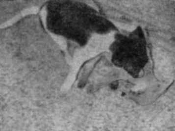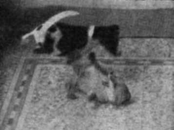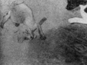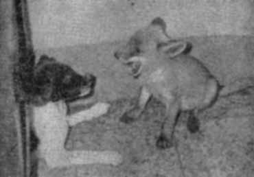 Что касается Кочиса и Блюе, то они принялись играть в эту игру уже в месячном возрасте. Что бы им не попадало тогда в лапы, а особенно мягкие предметы (клубки шерсти, тряпки), все это они тут же начинали теребить и терзать. Причем каждый старался забиться со своей добычей подальше в укромный уголок или под стол, дабы не уступить игрушку сопернику, который всегда был непрочь вырвать ее у товарища. Мы провели немало опытов с играющими щенками, подбрасывая им в качестве жертвы мелких животных. Межвидовые различия не замедлили сказаться и здесь. Об этом уже давно известно, и тут мы ничего нового не открыли. Но чтобы не перечеркивать проделанную нами работу, я бы отметил, как это принято, что своими опытами мы подтвердили ранее полученные данные, а именно: лисица, даже лишенная необходимых навыков, способна быстро обнаружить добычу, изловить ее и придушить (речь идет о мелких животных); что же касается собак, то здесь все происходит иначе.