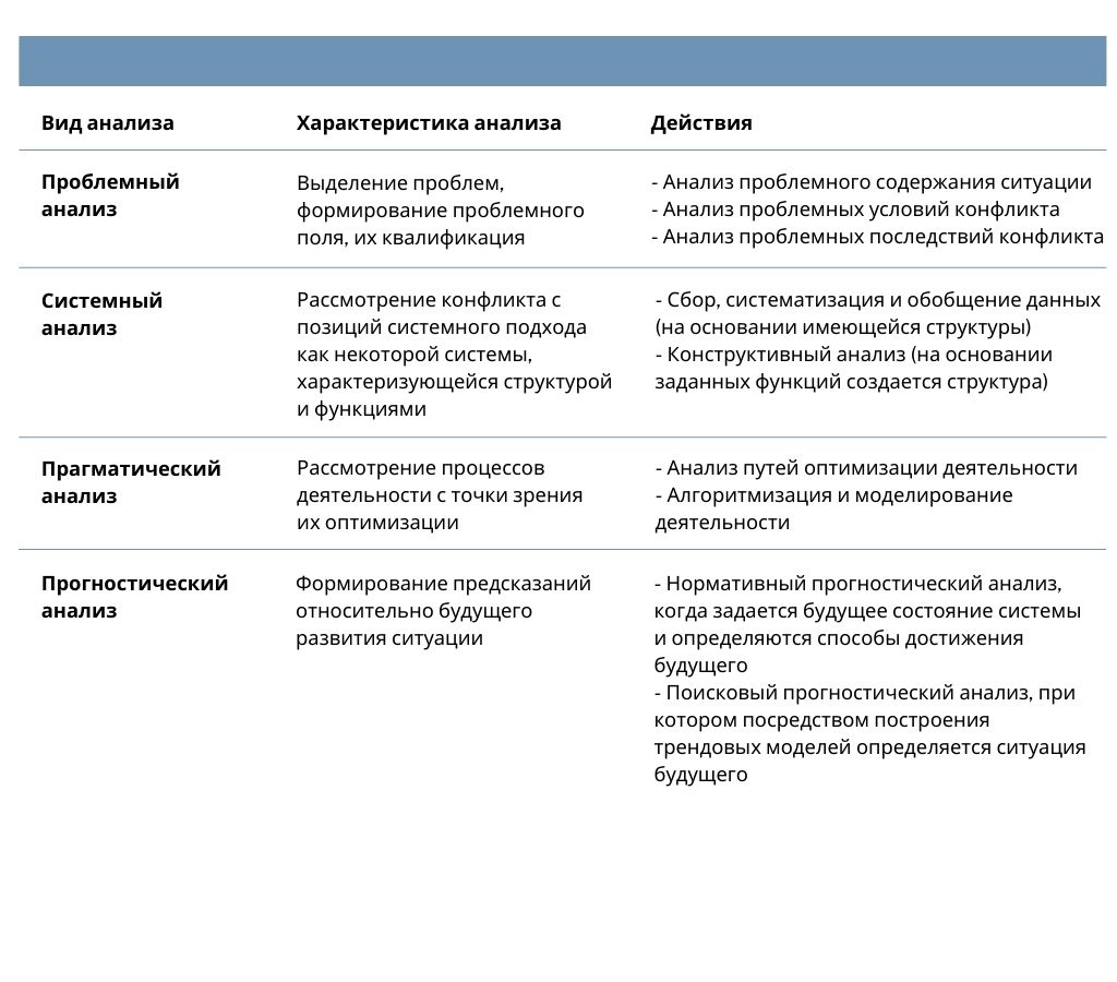 Первой ступенью в работе с конфликтами является анализ исходной ситуации. Он позволяет определить, с какой позиции или роли вы подходите к анализу конфликта, что случилось или может случиться, какие варианты развития ситуации оптимальны с учетом интересов сторон. Именно после анализа вырабатываются рекомендации и дальнейшие действия.