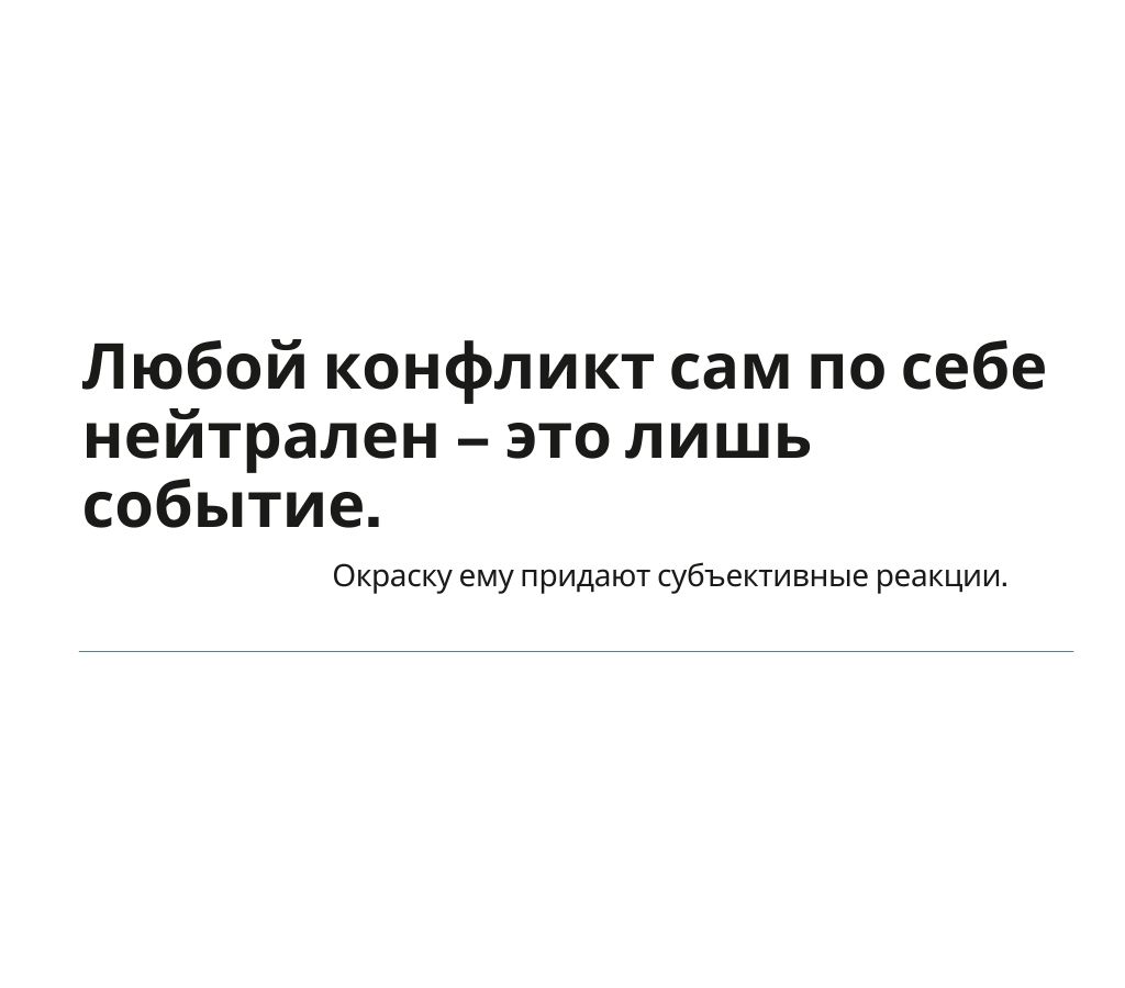 Конфликт – это симптом неполадки системы. Признавая конфликт и анализируя само противоречие, возможно найти ключевую проблему и поработать с ней. Проблема решена – симптомы исчезают.
