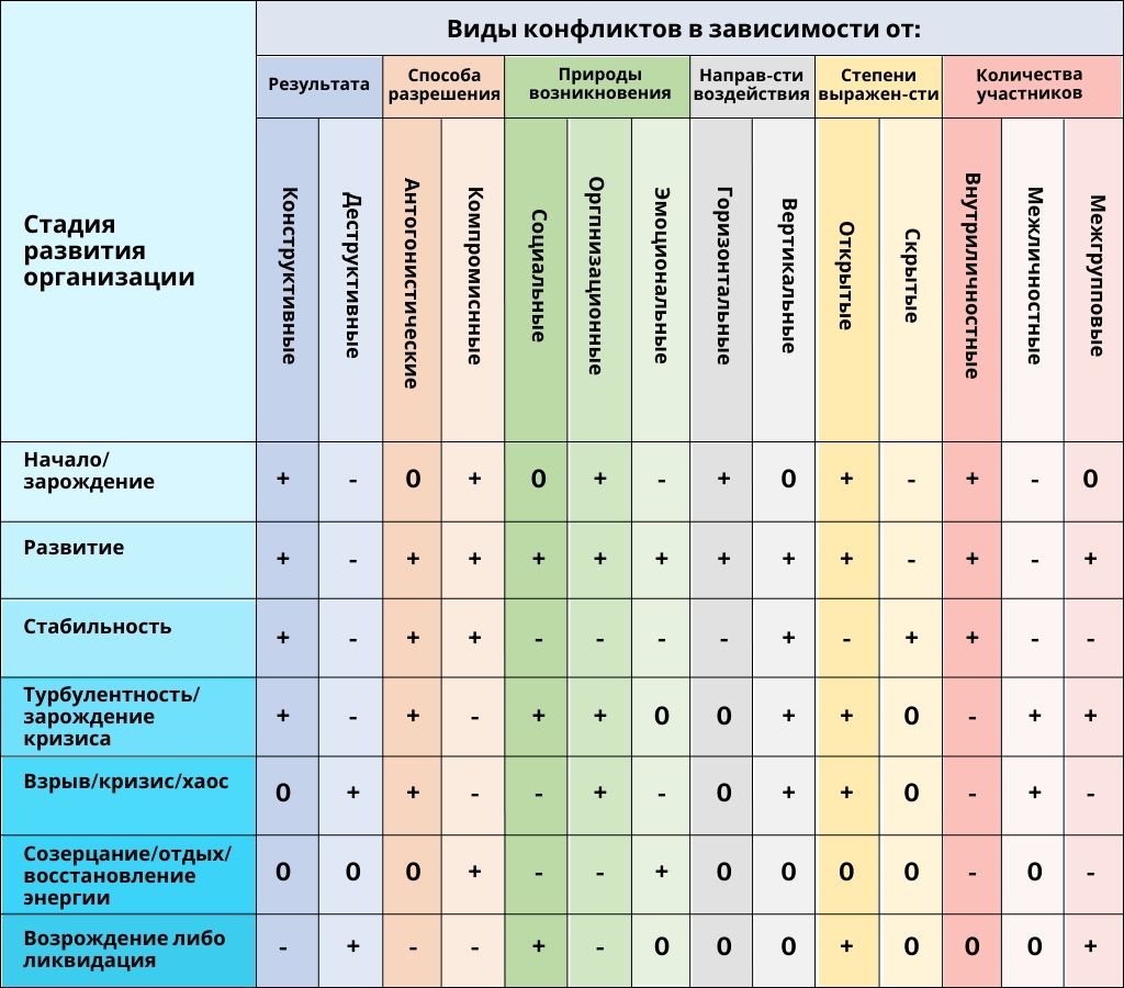 Предлагаю рассмотреть влияние разных видов конфликтов с учетом стадии развития организации. В настоящей матрице приведены варианты влияния, которые встречаются более чем в 65% случаев, однако исход конфликта во многом зависит от поведения сторон в конфликтной ситуации и управления самим противоречием с учетом вариативности. Данная таблица была сформирована как результат работы фокус-группы, состоящей из 10 HR-директоров различных предприятий и организаций. 6 месяцев мы разбирали и анализировали кейсы предприятий, сопоставляя влияние различных видов конфликтов на разных этапах развития организаций.