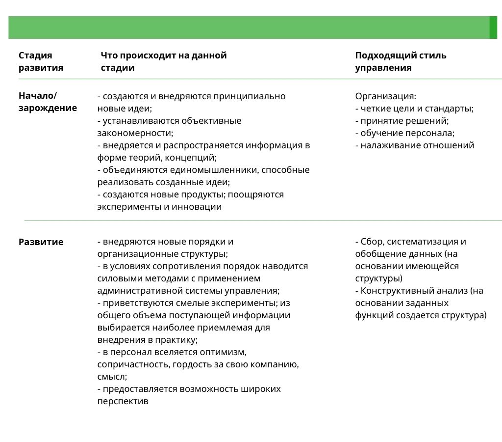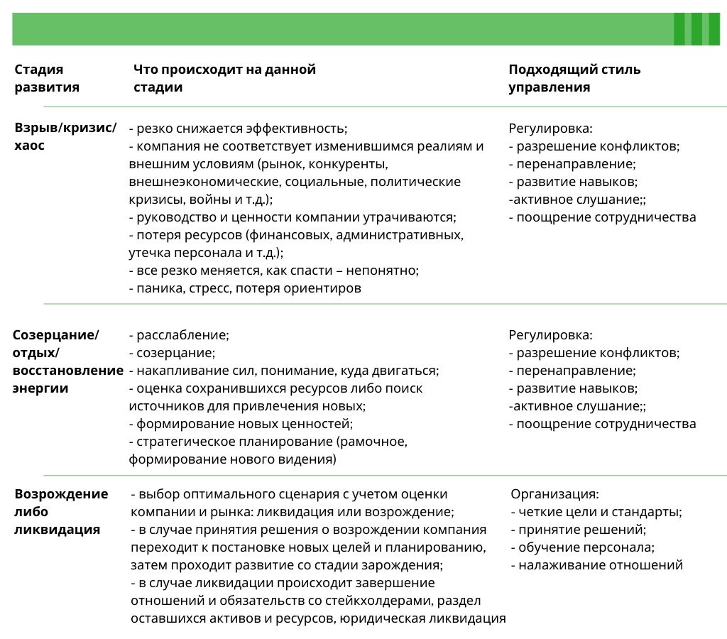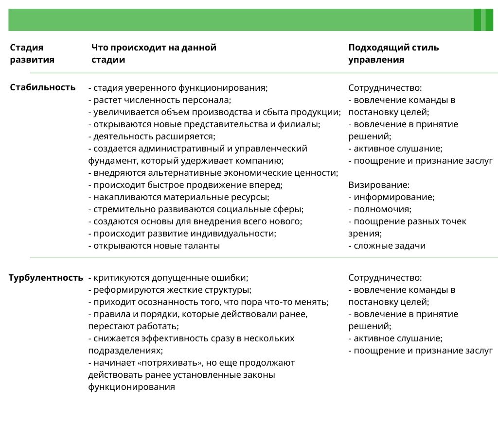 Во второй главе мы рассматривали стадии развития организации. На каждой стадии существуют стили лидерства, которые способны как ускорить прохождение данной стадии развития, так и разрушить целостность системы и нарушить ее баланс.