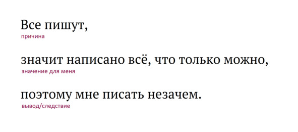 Например: «Все уже пишут – значит написано всё, что только можно написать, поэтому писать мне незачем».