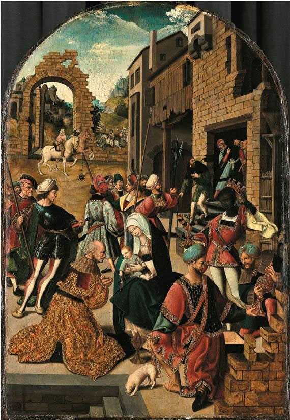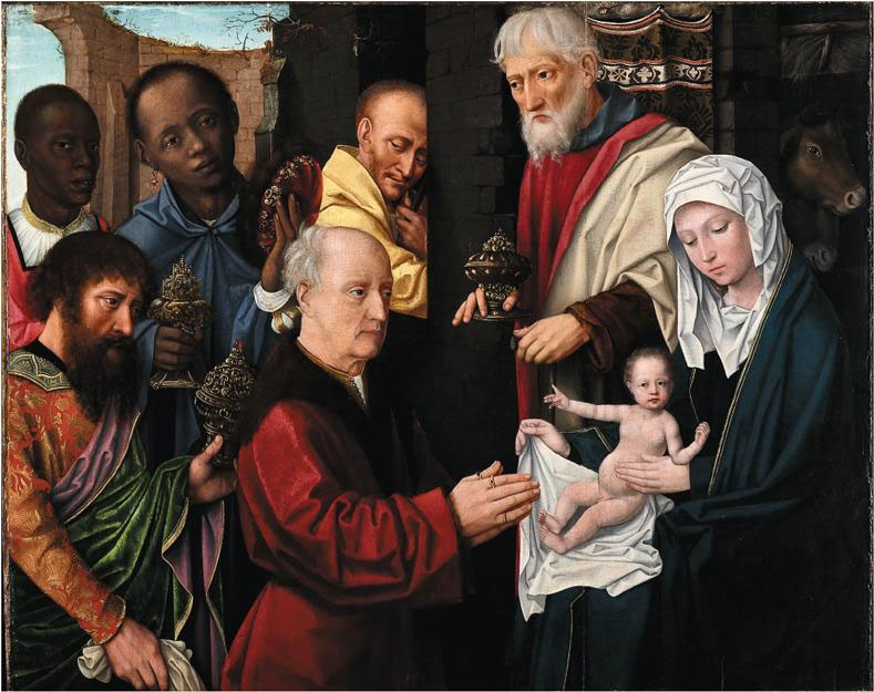 Рис. 10. Трое волхвов перед младенцем Христом, сидящим на коленях у Девы Марии. Старший из них стоит на коленях, сложив руки в жесте молитвы. Он уже передал свой дар седовласому Иосифу. Как и у Босха, чернокожего волхва с серьгой в ухе сопровождает чернокожий слуга.