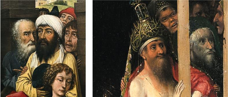 У ван дер Вейдена на голове человека в желтом тюрбан, а в руках он держит шапку с меховой оторочкой; так и у Босха на голове бородача в красном фантастический тюрбан с терновыми ветвями, а в руке он держит тяжелую корону еще более странной формы. К господину в желтом у ван дер Вейдена обращается седовласый старик; у Босха рядом с мужчиной в красном плаще тоже старик с темным лицом, красным носом и седыми клочковатыми волосами. У ван дер Вейдена из-за спины господина в тюрбане выглядывает человек со вздернутым носом и слегка приоткрытым ртом. Такой же типаж появляется у Босха. Очевидно, что мастер из Хертогенбоса перенес к себе эту группу, но придал всем персонажам более экзотичный и угрожающий вид.