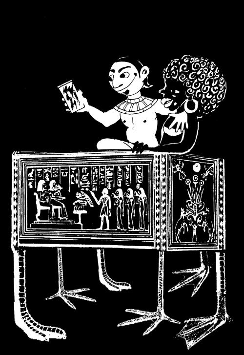 Стоило 007 увидеть, что посреди комнаты находится открытый мраморный гроб, установленный на четырех золотых ножках типа куриных, как он догадался, что попал в могильный склеп79. Гроб был наполнен прозрачной водой. Более того, на краю этого саркофага80 сидели и беседовали тет-а-тет8 двое молодых людей – он и она, опустив босые ноги в воду. Они брызгали ею друг другу в лицо, болтали ногами и с удовольствием ели виноград. При этом молодые люди обменивались шутками на смеси древних эфиопского82 и египетского языков, знакомых коту по урокам в Кот д’ИВУАР. ИГРЕК 007 сразу понял, что в разговоре с подругой парню приходится нелегко.