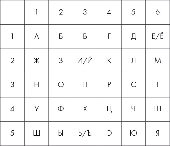 Оригинальный квадрат Полибия представлял собой таблицу 5 × 5 клеток, в каждой из которых подходила буква. В русском алфавите 33 буквы, поэтому мы воспользуемся таблицей 6 × 5. В нашем квадрате буквы Е и Ё будут записаны под одной цифрой. Также поступим с И и Й, Ъ и Ь. Первая цифра каждого числа – ряд, вторая – столбик.