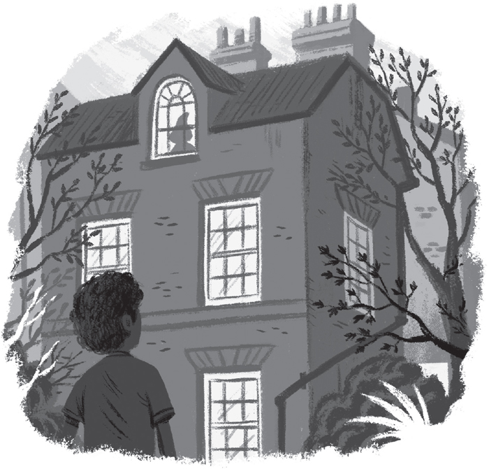 With a sigh I give up on Rose and wander around the garden. I peel some bark off a tree, kick a punctured football into a hedge, then hang from a branch. Tap, tap, tap goes Rose on her phone. I drop to the ground and look up at the attic window. ‘It’s still there,’ I say.