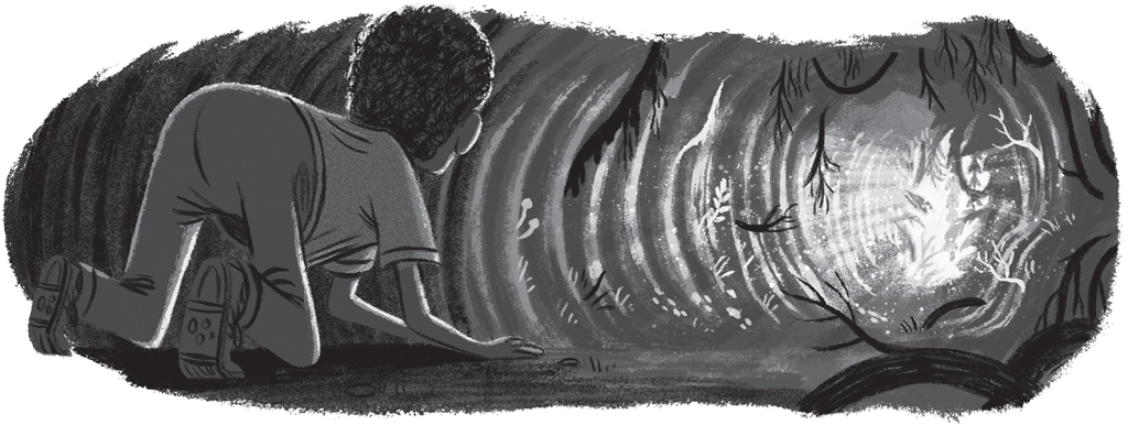 I start to crawl towards the green light. My head scrapes against the roof of the tunnel and rocks graze my hands, but I don’t stop until I reach the very end and the green light has become a curtain of leaves with light shining through it. Before I can change my mind I push my head through the leaves and crawl out into dazzling sunshine.