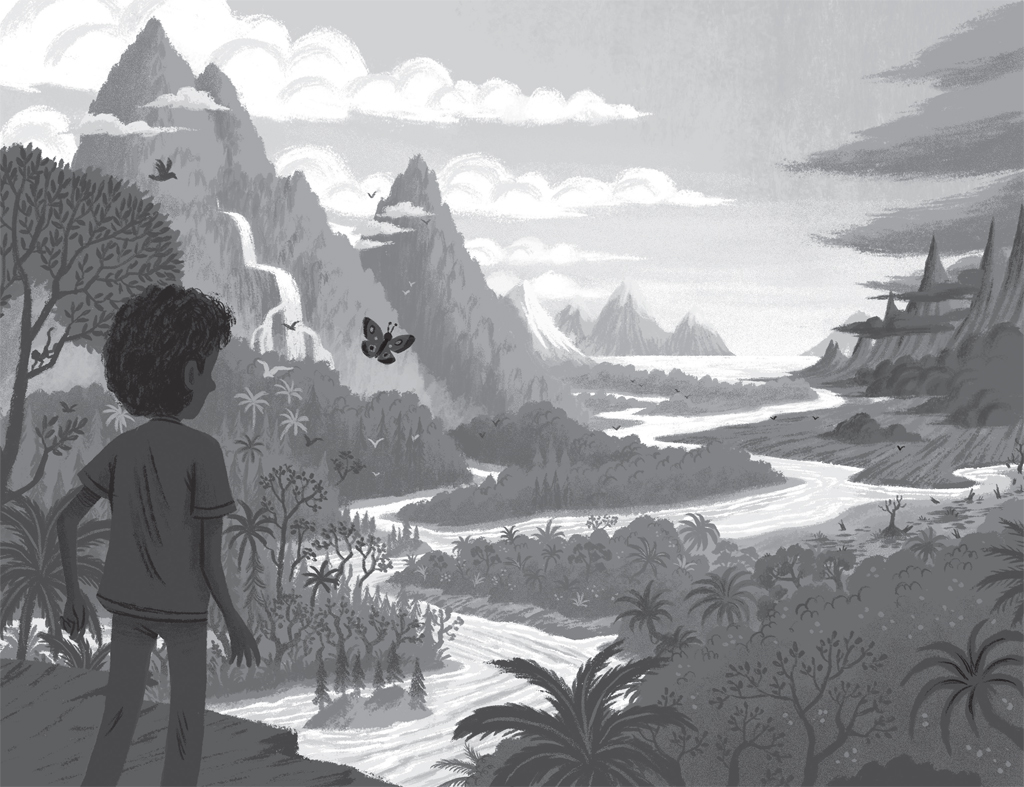 I blink and rub my eyes. I’m on a narrow ledge. I lean forward and see that the ledge is set into a cliff and far below me is a deep round pool. Trying to ignore the terrifying drop, I look straight ahead. I’m staring across a valley with a river winding through it. The river passes forests and mountains and glittering lakes. One side of the valley is bright and alive and bursting with leaves and colour, while the other half is shadowy and barren. The river has a shifting, swirling rainbow shine on its surface and it leads to a wild sea. Far, far away, beyond the sea, are snow-topped mountains.
