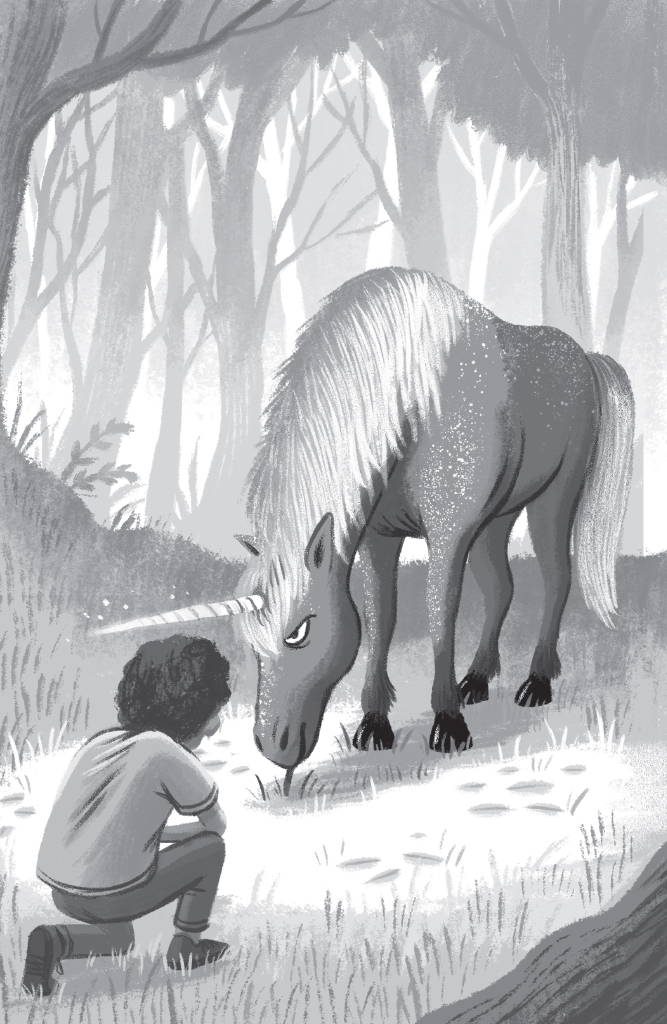 We keep as still as possible, listening to insects and watching spots of light dance across the forest floor. We don’t have to wait long. Soon we hear twigs snapping and leaves being pushed aside. ‘Are you sure it’s a unicorn?’ I ask, my heart speeding up. ‘I mean, how can you tell that’s a unicorn and not a scarecrow?’
