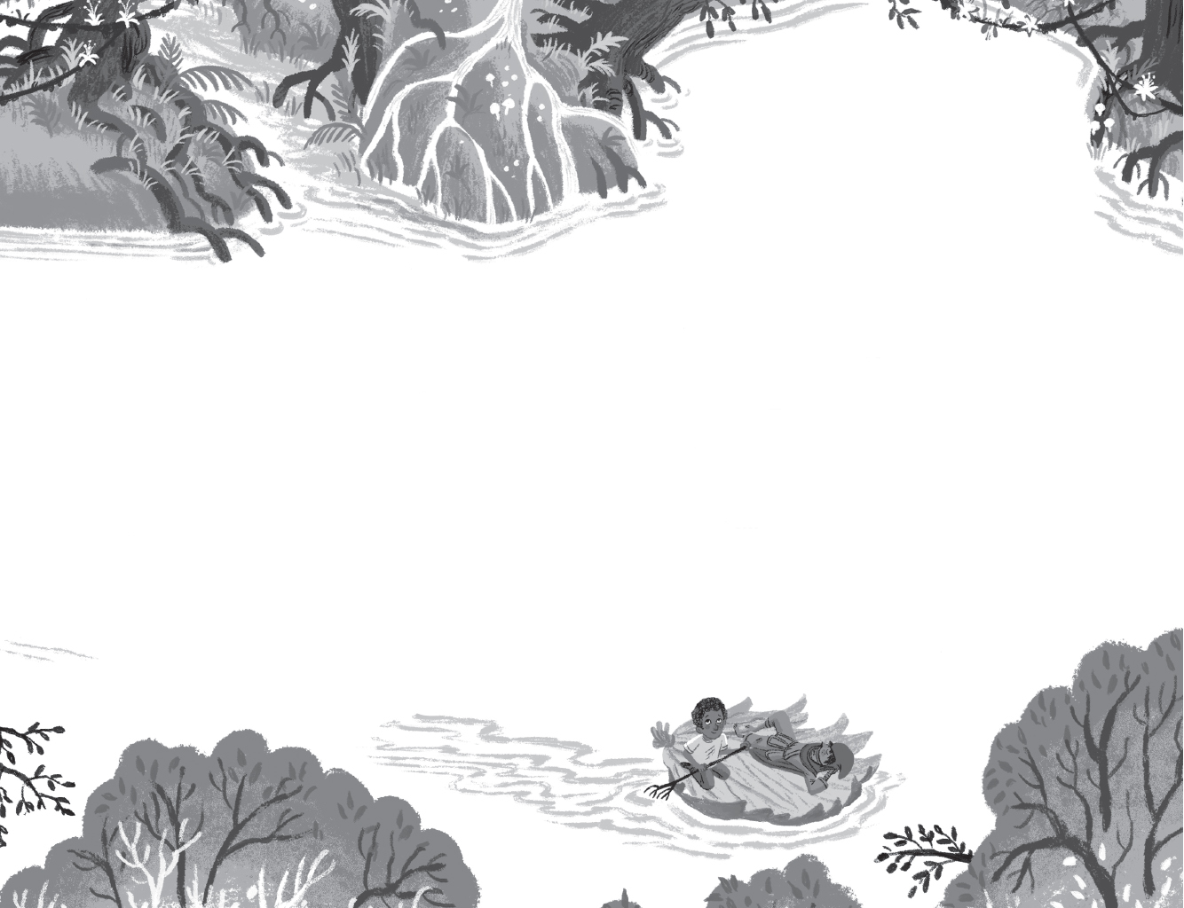 He listens for a moment then looks at me with big eyes and nods. Suddenly I feel very exposed dangling on this branch. ‘Maybe we should try jumping down,’ I say. The footsteps have stopped, but I’ve got the overwhelming feeling that somewhere in the dark trees, someone or something is watching us.