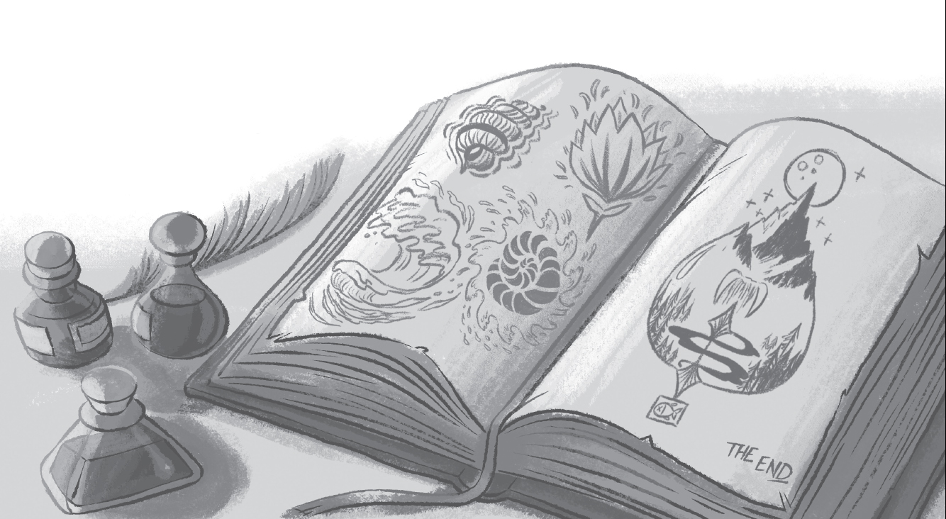 Like all merfolk, Mitch was covered in tattoos. I remember being at her hut and watching her dip a feather into one of these bottles then draw on her skin. The ink fizzed, smoke poured from the tip of the feather and then, somehow, the picture was permanent. I don’t know if the ink was magic, or the feather. It was just one of Mitch’s many secrets.