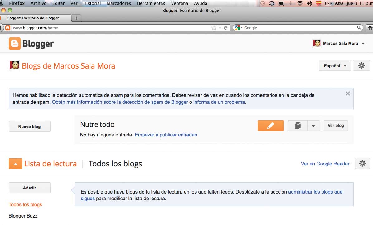 El escritorio de Blogger permite acceder fácilmente a todos los blogs del usuario, así como gestionarlos y administrar también las entradas de cada uno de ellos. De momento, mientras no haya publicado ninguna entrada, está vacío.