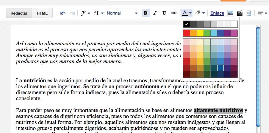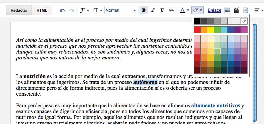 5 También puede destacar un texto utilizando las herramientas que se encuentran a continuación: Color de texto y Color de fondo de texto. Cada una de ellas cuenta con su propia paleta de colores. Seleccione alguna de las palabras en negritas, pulse en el botón Color de texto, que muestra una T subrayada, para desplegar su muestrario, y escoja el color que prefiera.