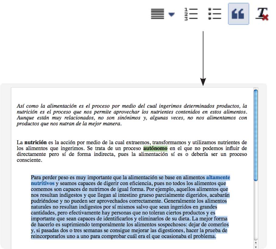 Al aplicar el formato de cita, se modifica el estilo del párrafo: los márgenes laterales aumentan y la alineación, por defecto, es hacia la izquierda.