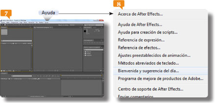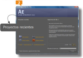 AL ABRIR AFTER EFFECTS CS5.5 la aplicación muestra el cuadro Bienvenida que permite, entre otras cosas, crear un nuevo proyecto, abrir uno existente o acceder a la ayuda.