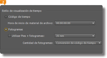 3.Recomendamos reservar esta opción para cuando trabajemos con película, pero vamos a ver sus opciones. Despliegue ahora el menú de Utilizar Pies + fotogramas.