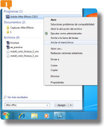 1.Antes de comenzar a trabajar en After Effects CS5.5, ancle el programa al menú Inicio de su ordenador. Para ello despliegue este menú, pulsando en el botón Inicio, que muestra un icono de Windows en la barra de tareas de su ordenador, ubique la aplicación usando el buscador, pulse sobre esta con el botón secundario de su ratón y seleccione la opción Anclar al menú Inicio.