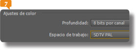 8.La siguiente categoría, Ajustes de color, le permite seleccionar la Profundidad de bits, que definirá la cantidad posible de colores de la imagen. Para trabajar en vídeo, que es lo que haremos en este manual, es más que suficiente una profundidad de 8 bits por canal, que es la seleccionada por defecto.