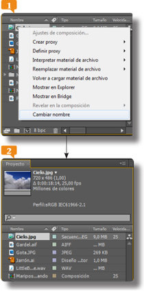 1.Puede pensar en el proyecto como un contenedor en el que se organizan las composiciones y sus materiales, y en el panel Proyecto como su catálogo. Seleccione el material CF101… , pulse con el botón secundario del ratón sobre él y de su menú contextual seleccione la opción Cambiar nombre.