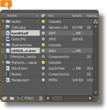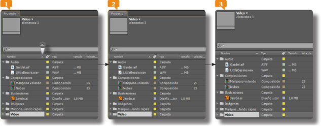 ADEMÁS DE ORGANIZAR SUS ARCHIVOS Y COMPOSICIONES en diferentes bandejas, puede personalizar la forma en la que el panel Proyecto organiza y muestra la información sobre los elementos que contiene.