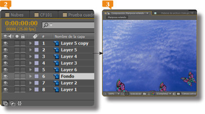 1.Abra con un doble clic la composición Mariposa volando que está almacenada en la carpeta Composiciones.