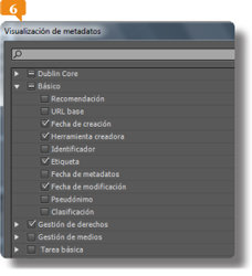 14.Se abre en este caso el cuadro Visualización de metadatos, donde puede seleccionar los datos que se mostrarán en el panel Metadatos. Despliegue el apartado Básico pulsando en el triángulo correspondiente.