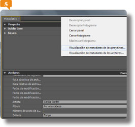 El panel Proyecto también contiene Metadatos. Los Metadatos son datos sobre los datos: información adicional que acompaña al contenido de un archivo. En el ejercicio que viene aprenderá cómo gestionarlos.