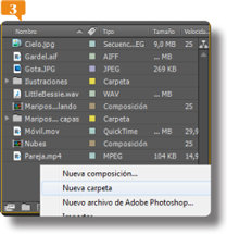 3.Resulta conveniente crear carpetas en las cuales clasificar los contenidos del proyecto. Seleccione el panel Proyecto, pulse en el comando Archivo de la Barra de menús y, del comando Nuevo, seleccione la opción Nueva carpeta.