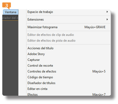 3. Aparece un submenú que le permite crear nuevos proyectos, nuevas secuencias para el mismo proyecto, además de bandejas, diferentes tipos de archivos y clips prediseñados. Evidentemente ahora podría accionar cualquiera de los comandos habilitados, que son los que se muestran con texto de color negro, con solo hacer un clic sobre su nombre. Despliegue el menú Ventana.