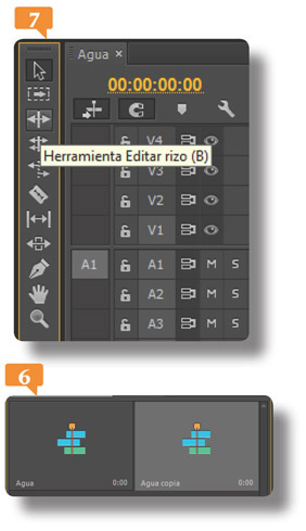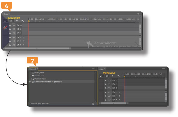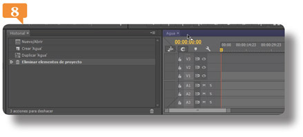 7. El panel Historia se ubica en primer plano en la ventana que ocupaba antes la secuencia Agua, mientras el panel de esta última pasa a segundo plano y muestra solo su pestaña. Para no dejar un espacio vacío, el panel Herramientas se ha expandido también hacia la izquierda.