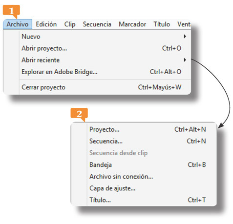 1. Ahora que nuestro proyecto tiene una secuencia, vamos a conocer otros elementos de la interfaz. Pulse en el comando Archivo del la Barra de tareas para analizar las opciones que contiene.