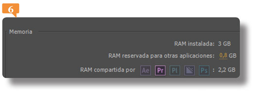 9. Se abre una ficha que le indica la memoria RAM instalada en su equipo, la reservada para otras aplicaciones y la disponible para Premiere Pro, After Effects, Prelude y Adobe Media Encoder y Photoshop.