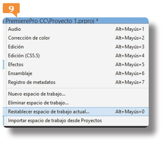 8. En cualquier momento puede volver al espacio de trabajo original. Muestre el menú Ventana, luego muestre el submenú espacio de trabajo, y seleccione la opción Restablecer espacio de trabajo actual.