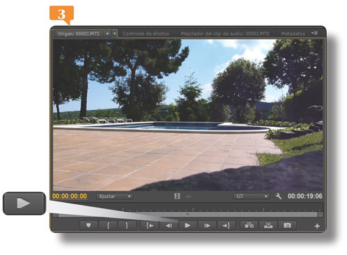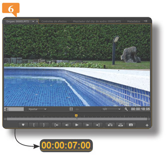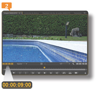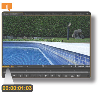 2. Habrá notado que este monitor, al igual que el Monitor del programa, tiene dos códigos de tiempo. El la izquierda, de color amarillo, indica el código del cuadro en pantalla, que en estos momentos debería ser 00:00:00:00, siempre que el marcador de reproducción se encuentre al comienzo del clip. Pulse en la Barra espaciadora y avance hasta que pase del primer segundo, es decir, el código 00:00:01:00.