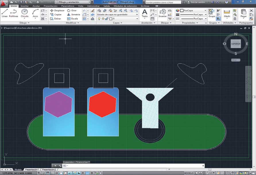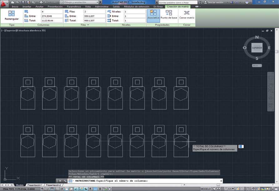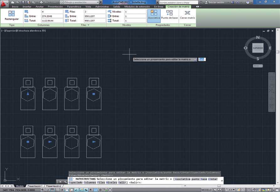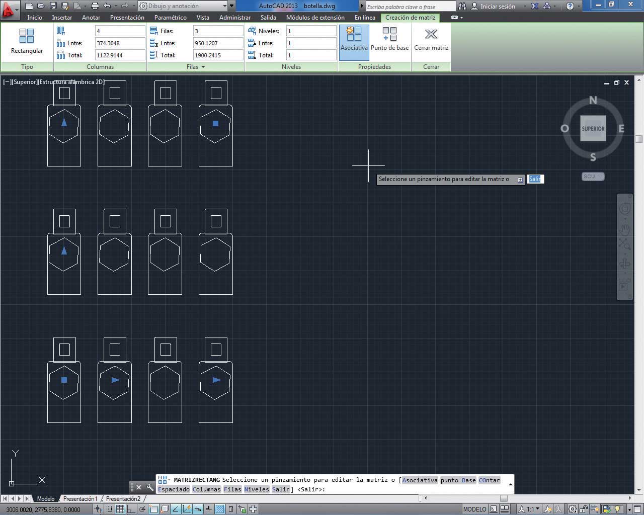 12 Como ha podido comprobar, en AutoCAD 2013 el trabajo con matrices es mucho más intuitivo ya que se puede llevar a cabo directamente sobre el Área de trabajo. Para dar por acabado este ejercicio, deseleccione la matriz rectangular pulsando la tecla Escape y guarde los cambios.