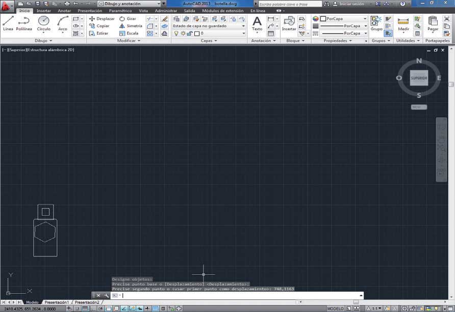 6 A continuación, precise como punto base para el desplazamiento de nuevo el centro de la botella y escriba como punto final las coordenadas 748,1163, pulsando la tecla retorno para hacer efectivo el cambio de posición. (6)
